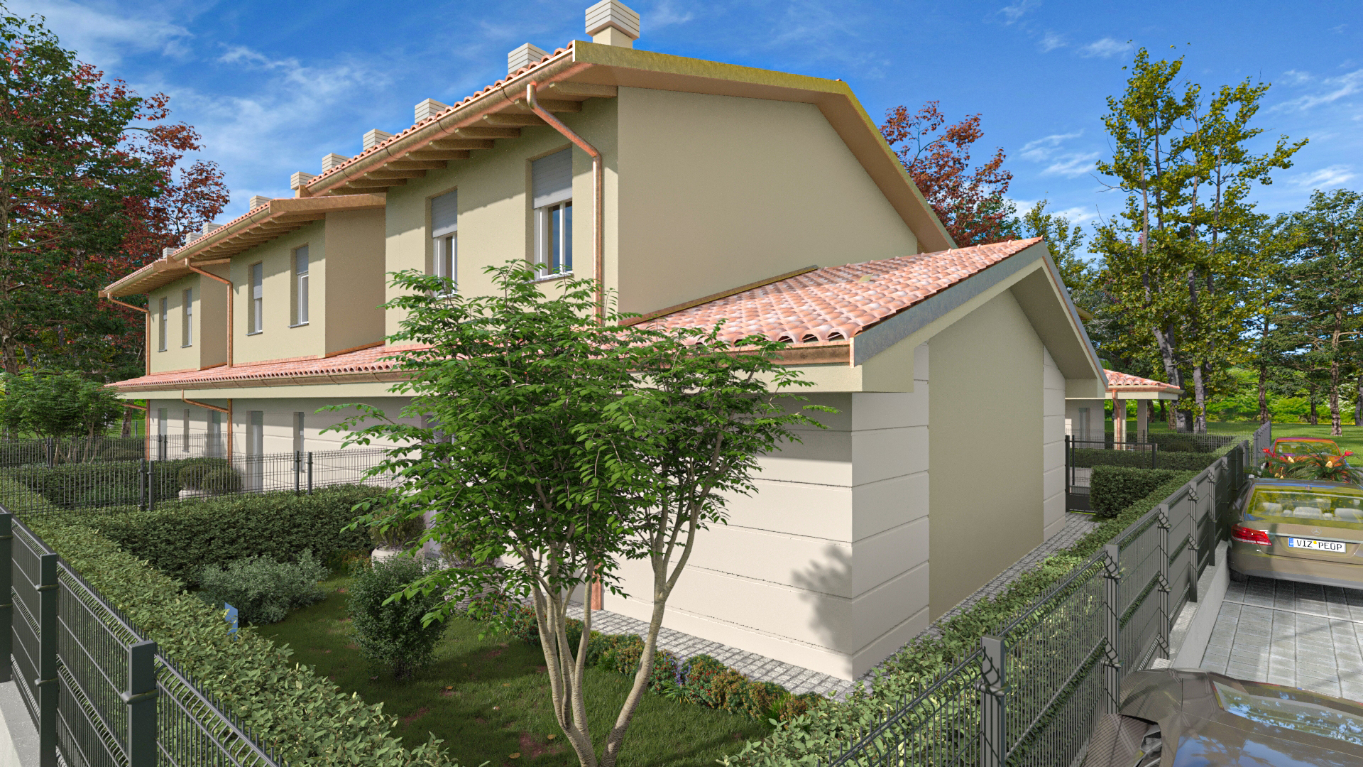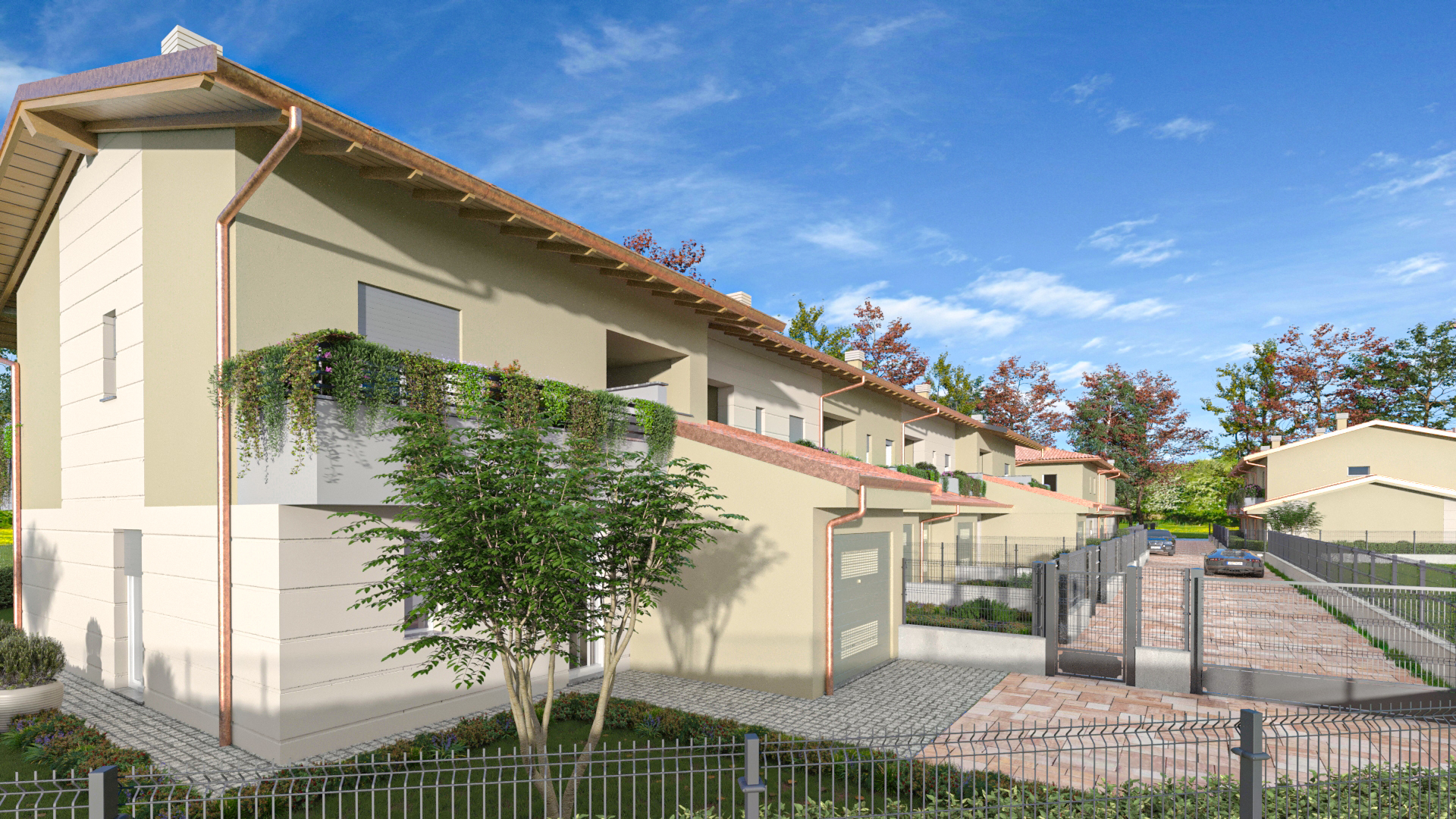 Il complesso è completamente recintato e dotato di accessi pedonali e carrai indipendenti, con cancelli elettrificati, videocitofoni e accesso ai box tramite cancello automatizzato.