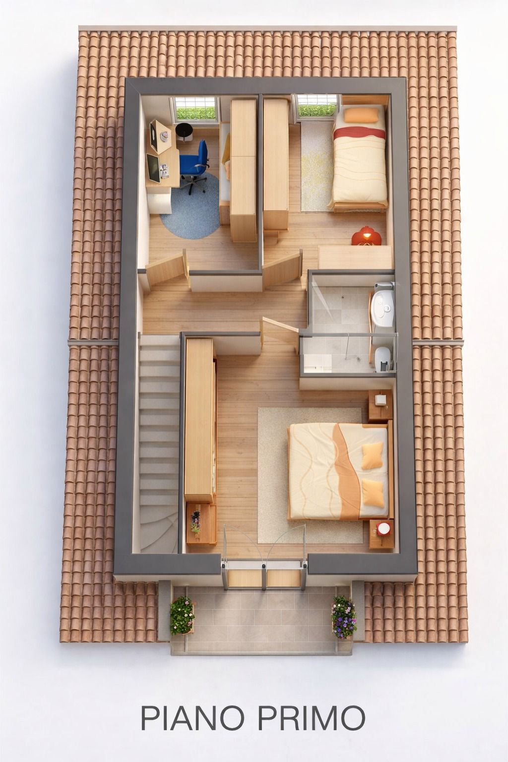 Piano primo: zona notte composta da 3 camere da letto, balcone e servizi