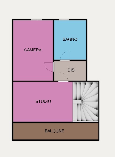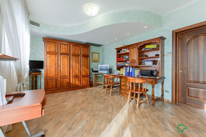 Al livello superiore troviamo un ampio locale studio, luminoso e con affaccio su un grande balcone: uno spazio ideale come zona smart-working o facilmente trasformabile in ulteriore camera.