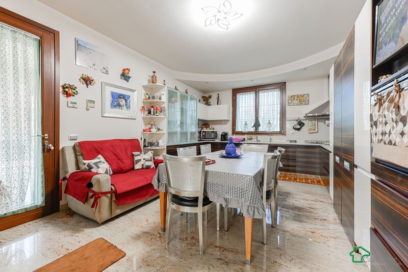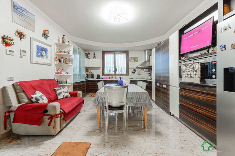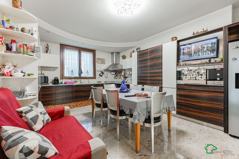La cucina abitabile, moderna e funzionale, è dotata di un pratico locale dispensa/lavanderia completamente nascosto da arredi su misura.